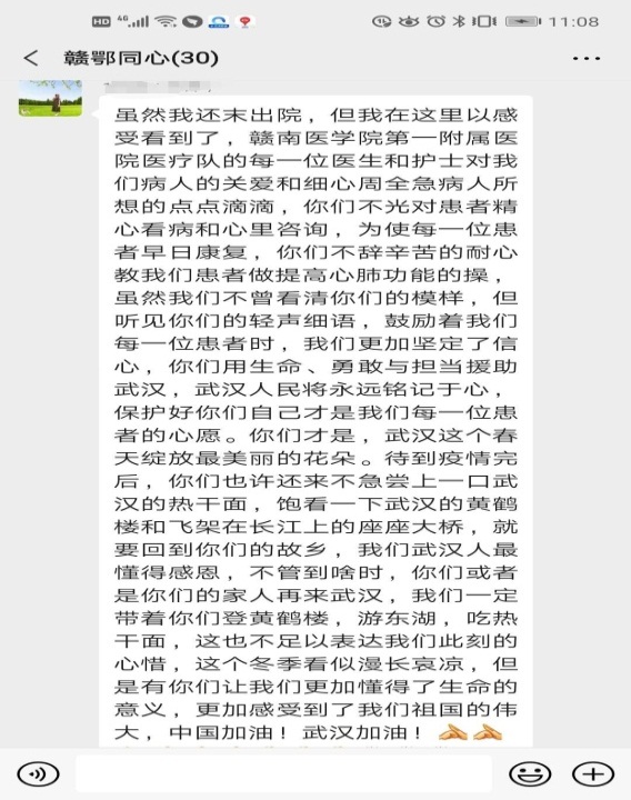 “虽然我还末出院,但我在这里以感受看到了,赣南医学院第一附属医院医疗队的每一位医生和护士对我们病人的关爱和细心周全急病人所想的点点滴滴,你们不光对患者精心看病和心里咨询,为使每一位患者早日康复,你们不辞辛苦的耐心教我们患者做提高心肺功能的操,虽然我们不曾看清你们的模样,但听见你们的轻声细语,鼓励着我们每一位患者时,我们更加坚定了信心,你们用生命、勇敢与担当援助武汉,武汉人民将永远铭记于心,保护好你们自己才是我们每一位患者的心愿。你们才是,武汉这个春天绽放最美丽的花朵。待到疫情完后,你们也许还来不急尝上一口武汉的热干面,饱看一下武汉的黄鹤楼和飞架在长江上的座座大桥,就要回到你们的故乡,我们武汉人最懂得感恩,不管到啥时,你们或者是你们的家人再来武汉,我们一定带着你们登黄鹤楼,游东湖,吃热干面,这也不足以表达我们此刻的心惜,这个冬季看似漫长哀凉,但是有你们让我们更加懂得了生命的意义,更加感受到了我们祖国的伟大,中国加油!武汉加油!”