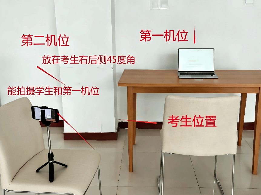 5.“双机位”要求。“第一机位”主机位位于考生正前方,负责采集考生音、视频源,音频视频必须全程开启,复试全程考生须免冠正对摄像头,保持坐姿端正,面部、上半身及双手在画面中清晰可见;“第二机位”辅机位从考生后方成45°拍摄,要保证考生及主机位屏幕被复试专家组清晰看到。
